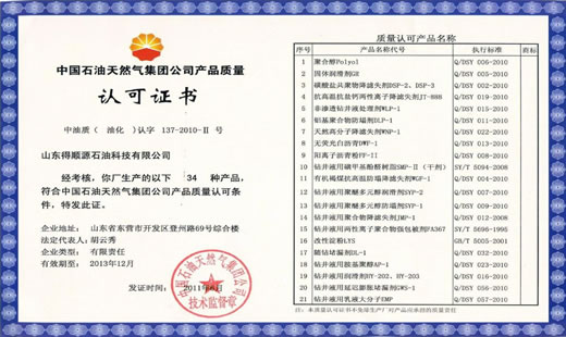公司建立了先進(jìn)完善的內(nèi)控體系和質(zhì)量控制體系,通過(guò)了API spec Q1及API 13A認(rèn)證、ISO9001質(zhì)量管理體系認(rèn)證、14001環(huán)境體系認(rèn)證、18001職業(yè)安全健康體系認(rèn)證、HSE健康安全環(huán)保體系認(rèn)證和CNPC油田化學(xué)劑質(zhì)量認(rèn)證。